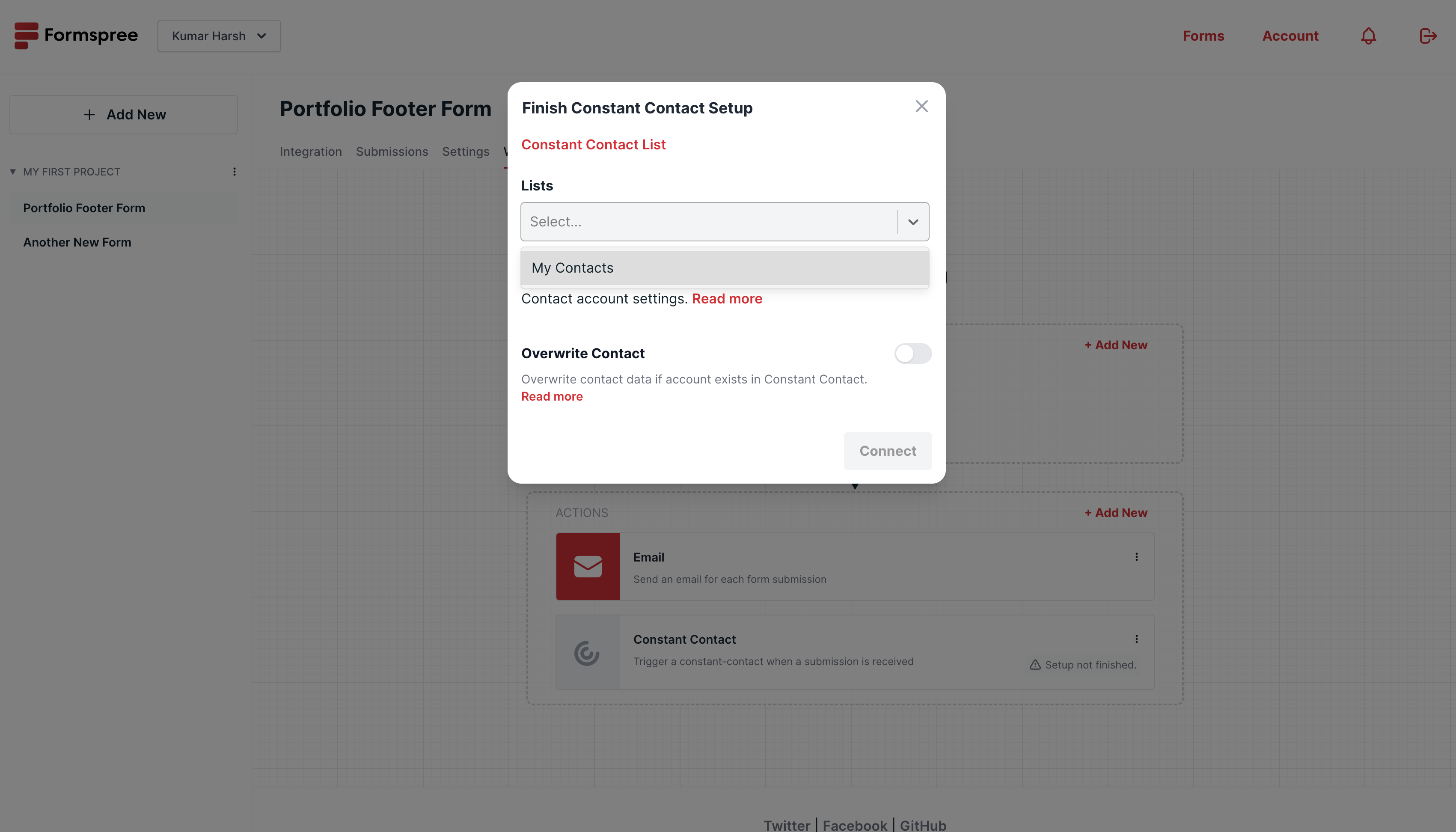 Do you use Constant Contact to manage your email marketing? Now, with our new Constant Contact plugin, you can effortlessly add new contacts to your directory directly through your Formspree forms. Simply, add a new action to your form workflow and select Constant Contact: