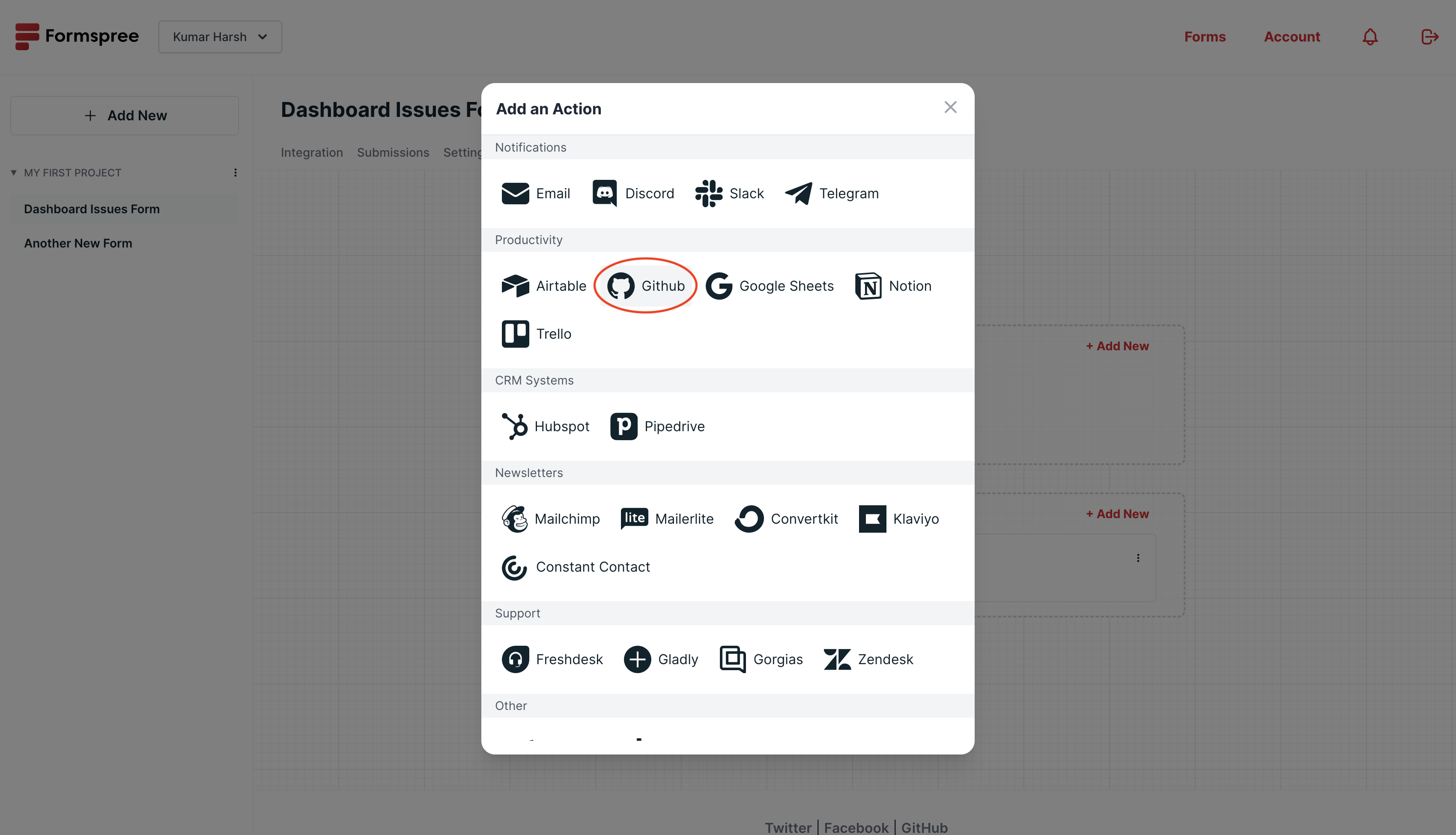Simply, add a new action to your form workflow and select GitHub: