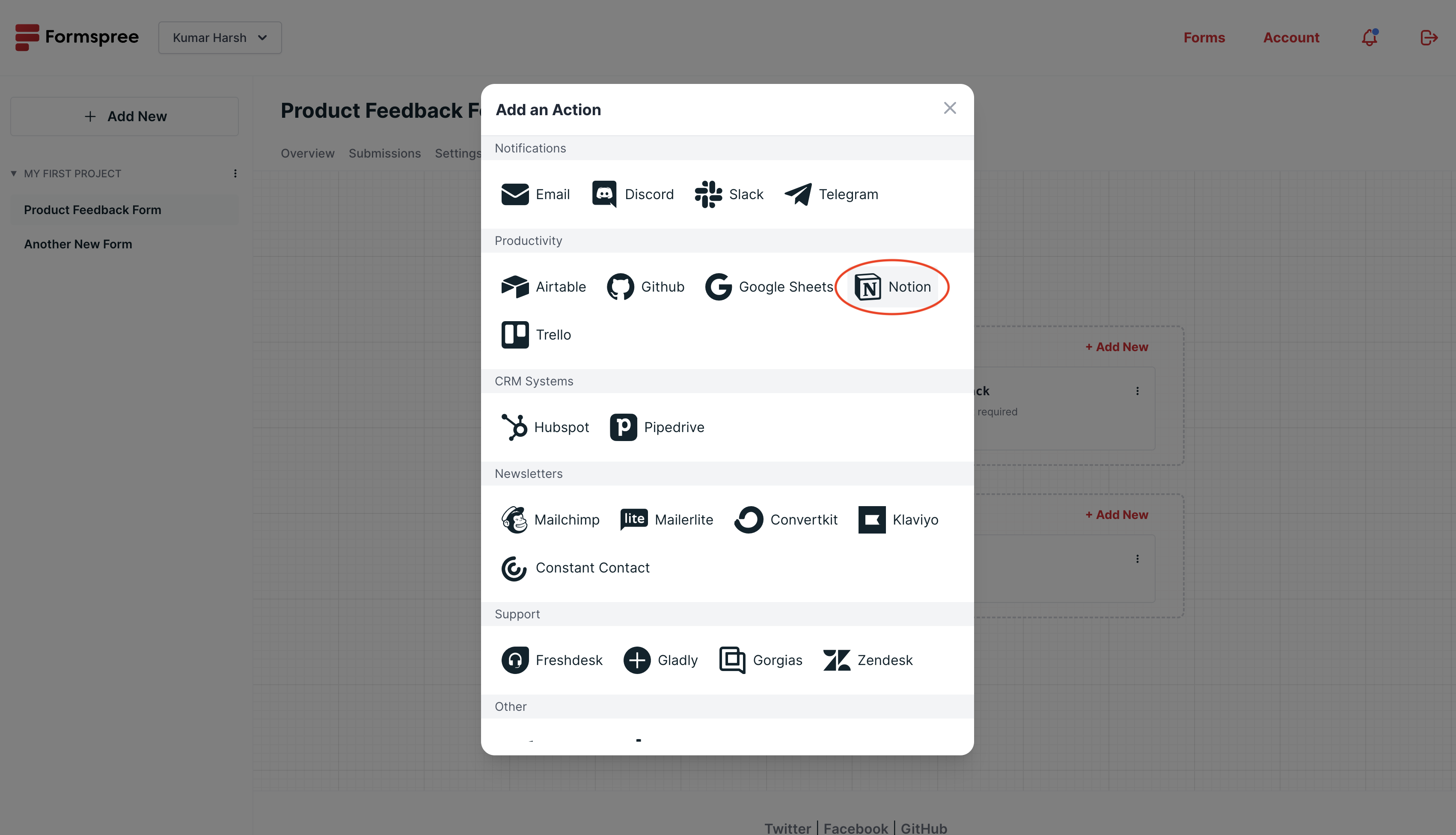Simply, add a new action to your form workflow and select Notion:
