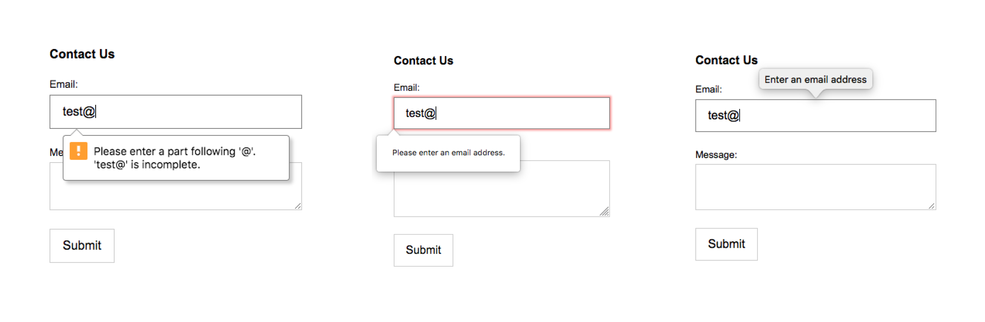 - Inconsistent UX: Since this method uses the browser’s built-in validation features, you must either accept the browser’s UX or write your own CSS to override these default styles, which sometimes involves browser-specific attributes. If you want to achieve a consistent design across browsers, controlled components are a better approach.