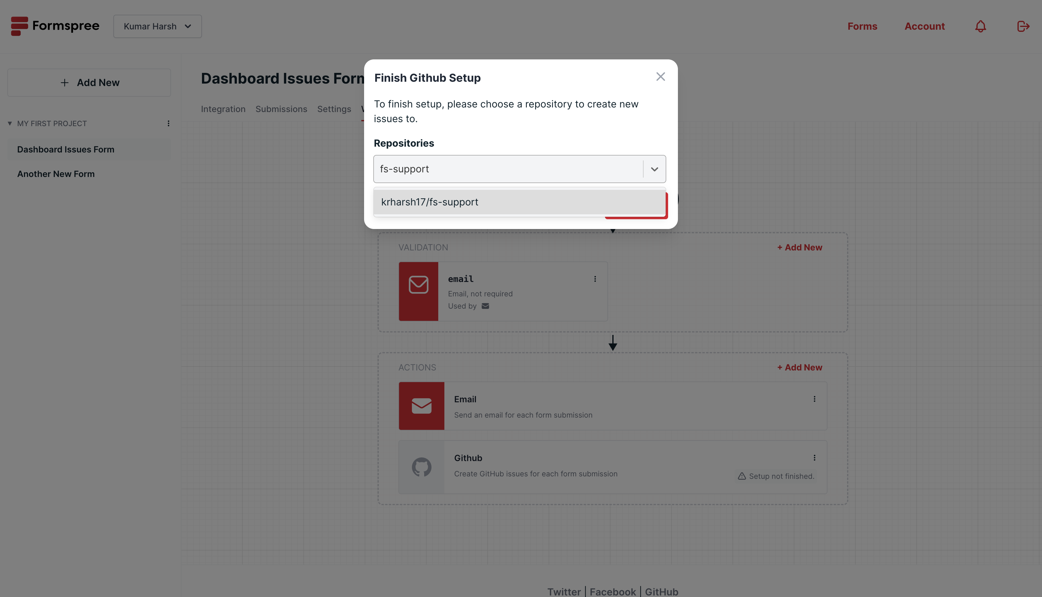 Simply, add a new action to your form workflow and select GitHub: