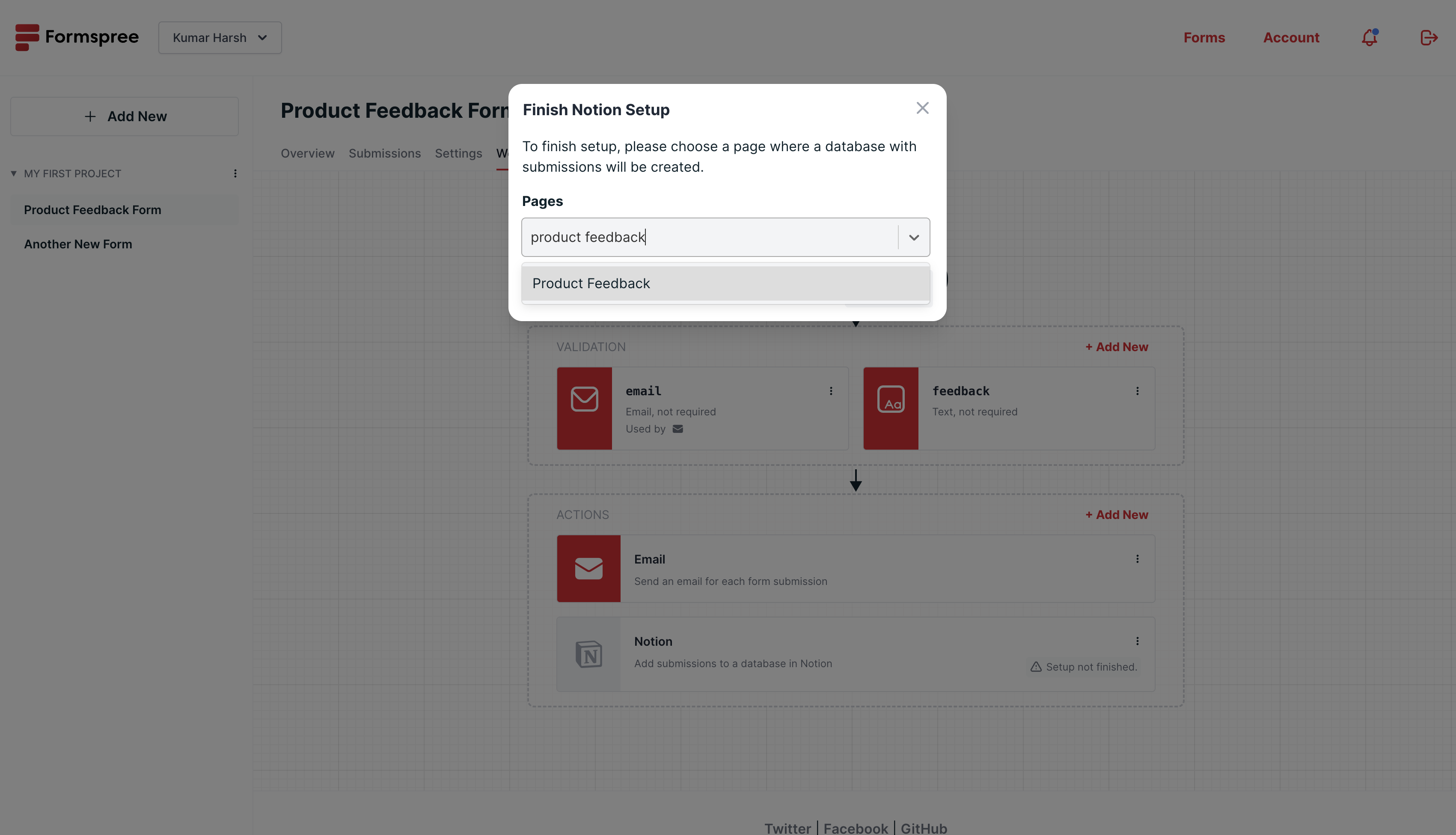Then, you will need to authorize Formspree to access your Notion account and choose which page you want to create the database for your form submissions in: