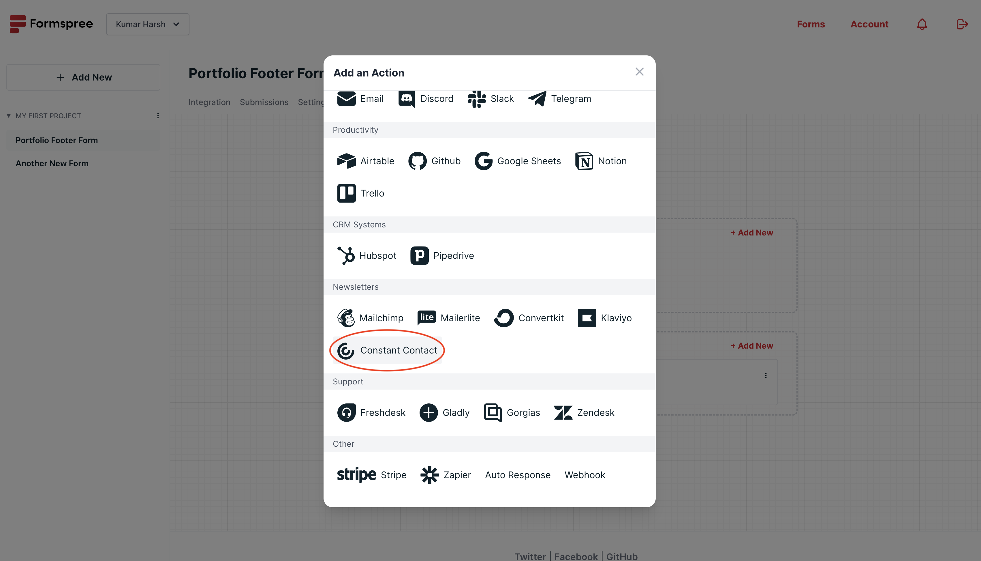 Do you use Constant Contact to manage your email marketing? Now, with our new Constant Contact plugin, you can effortlessly add new contacts to your directory directly through your Formspree forms. Simply, add a new action to your form workflow and select Constant Contact: